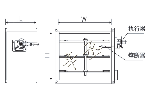 1.平时为常开状态,当阀门内温度达到280℃时,易熔片熔断,阀门在弹簧力作用下关闭并输出关闭信号,切断烟气沿风管蔓延,阀门动作后手动复位。
