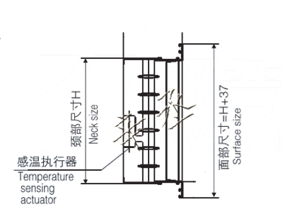 能自动感测气流温度,并驱动风口颈部的调节板,以改变风口的吹出面积,从而调节气流的吹出速度。当夏季送风温度≤17度时,调节板自动调为全开,风口吹出面积增大,气流吹出速度减小,避免明显的冷风吹出感;当冬季送风温度≥27度时,调节板自动关小,气流吹出速度增快,使热风获得更远的送风距离。感温执行器无需人工或电源及电控设备,具有节能、环保、性能稳定、安装方便、免维护等优点。