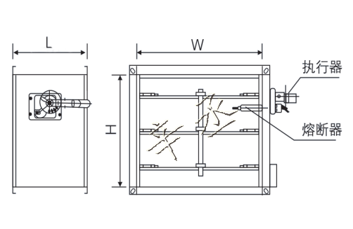 1.平时为常开状态,当阀门内温度达到70℃时,易熔片熔断,阀门在弹簧力作用下关闭并输出关闭信号,切断烟气沿风管蔓延,阀门动作后手动复位。