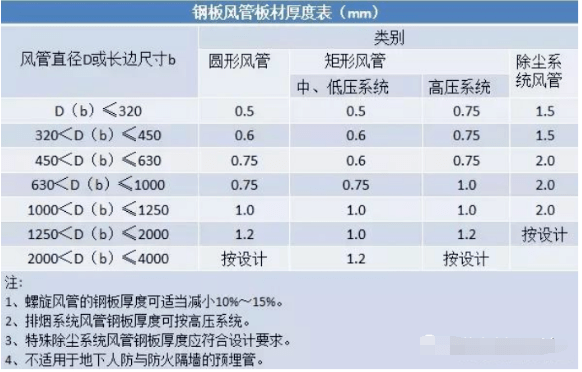 根据施工现场具体情况,采用角钢法兰、共板法兰和插条式连接三种工艺连接或者联合使用。工艺及风管边长划分、风管钢板厚度如下: