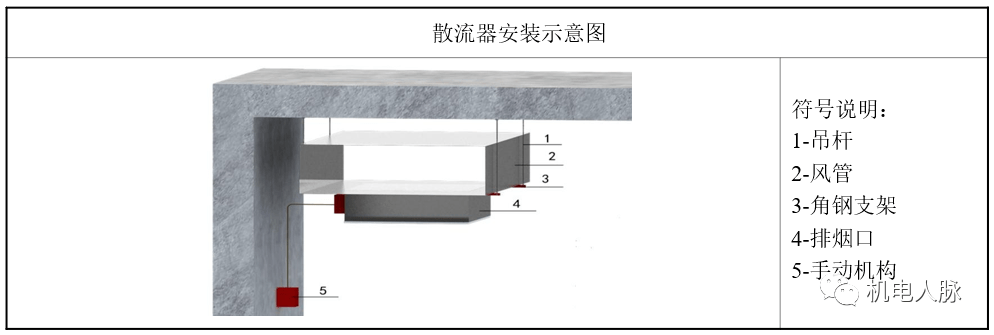 排烟口在吊顶安装时,排烟管道安装底标高距吊顶面的尺寸应大于250mm以上;排烟口操作装置的电气接线及控制缆绳采用DN20套管,控制缆绳套管的弯曲半径不小于250mm,弯曲数量一般不多于3处,缆绳长度一般不大于6m。