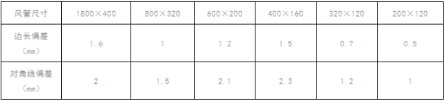 风管大边长≤300mm时,外边长偏差≤2mm,两对角线长度之差≤3mm;风管大边长>300mm时,外边长偏差≤3mm,两对角线长度之差≤3mm。对风管尺寸进行测量,风管尺寸偏差见下表: