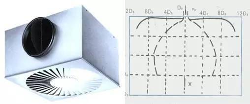 出风是旋转射流,诱导比大,速度衰减大,可用于大风量、大温差送风,安装在天花板上或顶棚上。适用于下送风。