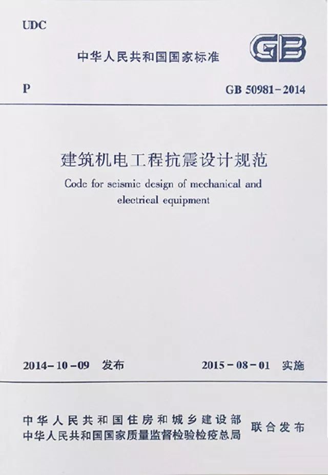 国家于2014年10月9日发布GB 50981-2014《建筑机电工程抗震设计规范》,并于2015年8月1日开始实施。规范总则1.0.1如下: